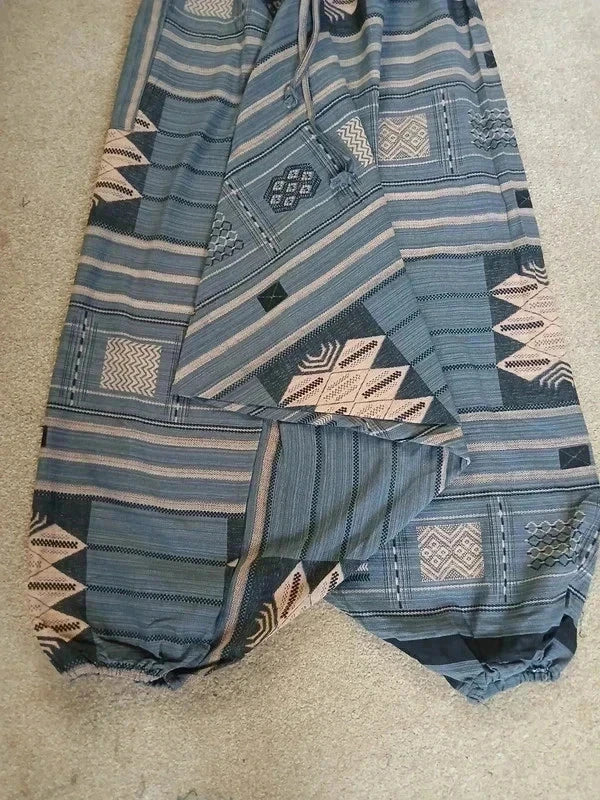 Step into effortless comfort with these grey Thai harem trousers, blending traditional tribal craftsmanship with the timeless ease of Aladdin-style pants. Designed for all seasons, they’re cool and breathable in summer yet cozy for layering in the cooler months—making them a year-round essential. Whether you’re flowing through yoga, dancing at festivals, traveling the world, or simply relaxing at home, these trousers bring freedom, style, and comfort to every day. 🌿