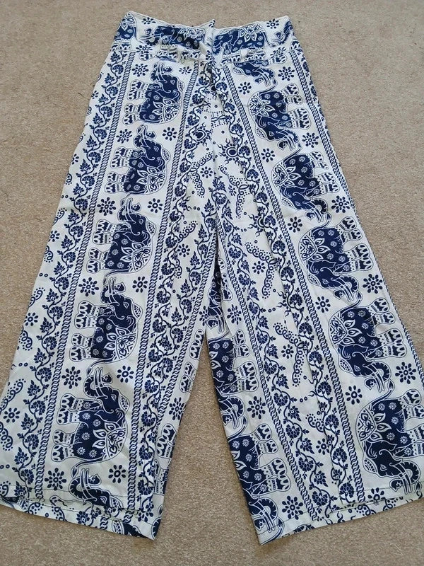 Navy Blue White Thai Elephant Womens Wrap Trousers Hippie Harem Festival Boho Pants