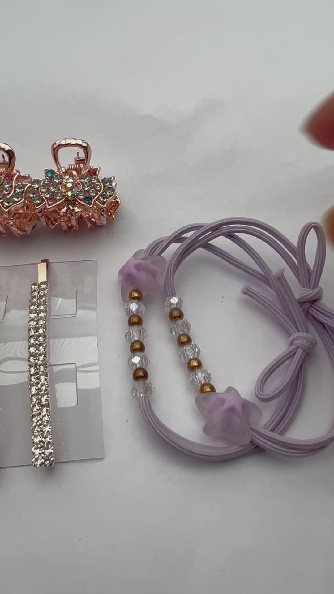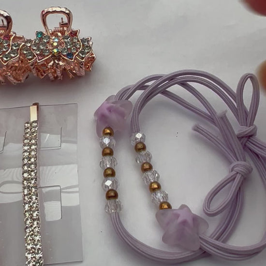 Complementing the purple hair ties are our dazzling Crystal Hair Clips, each one a miniature masterpiece of shimmering elegance. Adorned with sparkling crystals in shades of pink and rose, these hair clips add a touch of glamour to any hairstyle, whether you're attending a formal event or simply jazzing up your everyday look. With their intricate designs and radiant sparkle, these clips are sure to make you feel like royalty wherever you go.