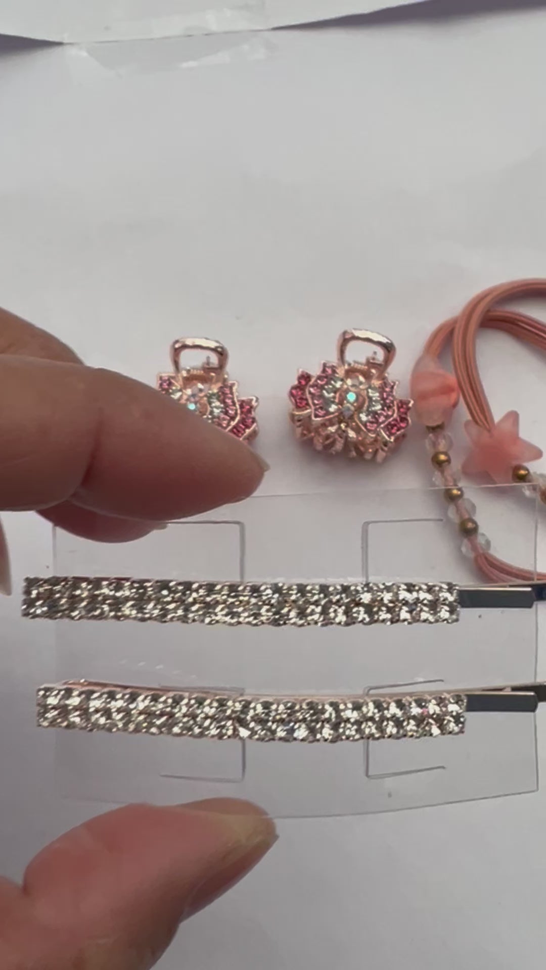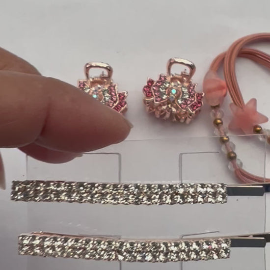 Complementing the hairbands are two Pink Rose Crystals Hair Claws, designed to secure your tresses with a touch of sparkle and sophistication. Each claw features a radiant pink rose embellished with shimmering crystals, adding a dash of glamour to any hairstyle. Embrace versatility as you effortlessly transition from casual daytime chic to evening allure.